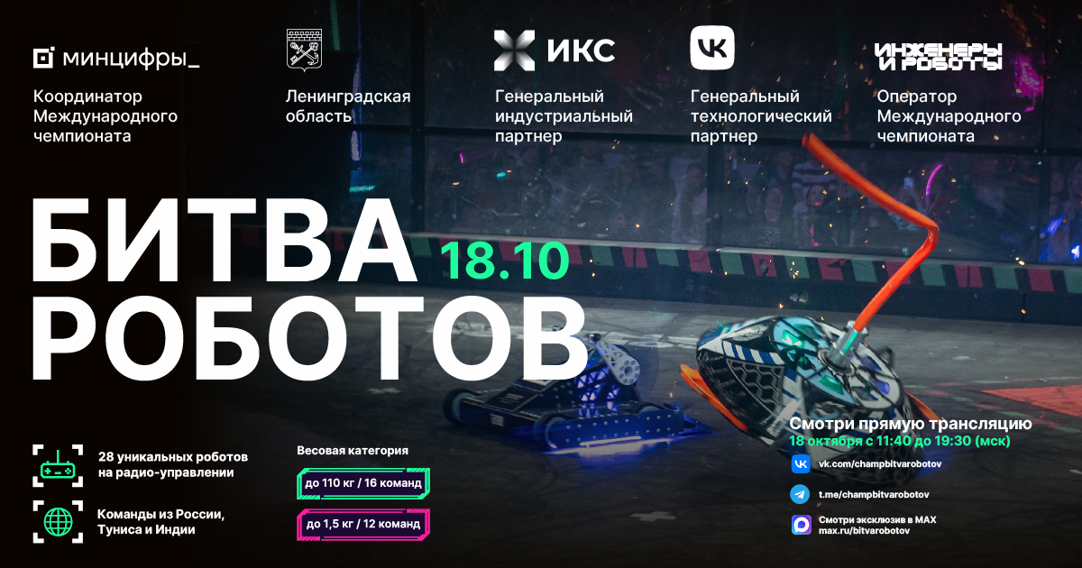В третьем отборочном этапе Чемпионата сразятся 28 команд из России, Туниса и Индии: 16 команд в рамках дисциплины «Битва роботов» в весовой категории до 110 килограмм и 12 команд в рамках дисциплины «Битва мини-роботов» в весовой категории до 1,5 килограмм. Среди участников – команды МГТУ им. Н.Э. Баумана, НИТУ МИСИС, НИЯУ МИФИ, РГСУ, БГТУ им. В.Г. Шухова и других ведущих университетов.